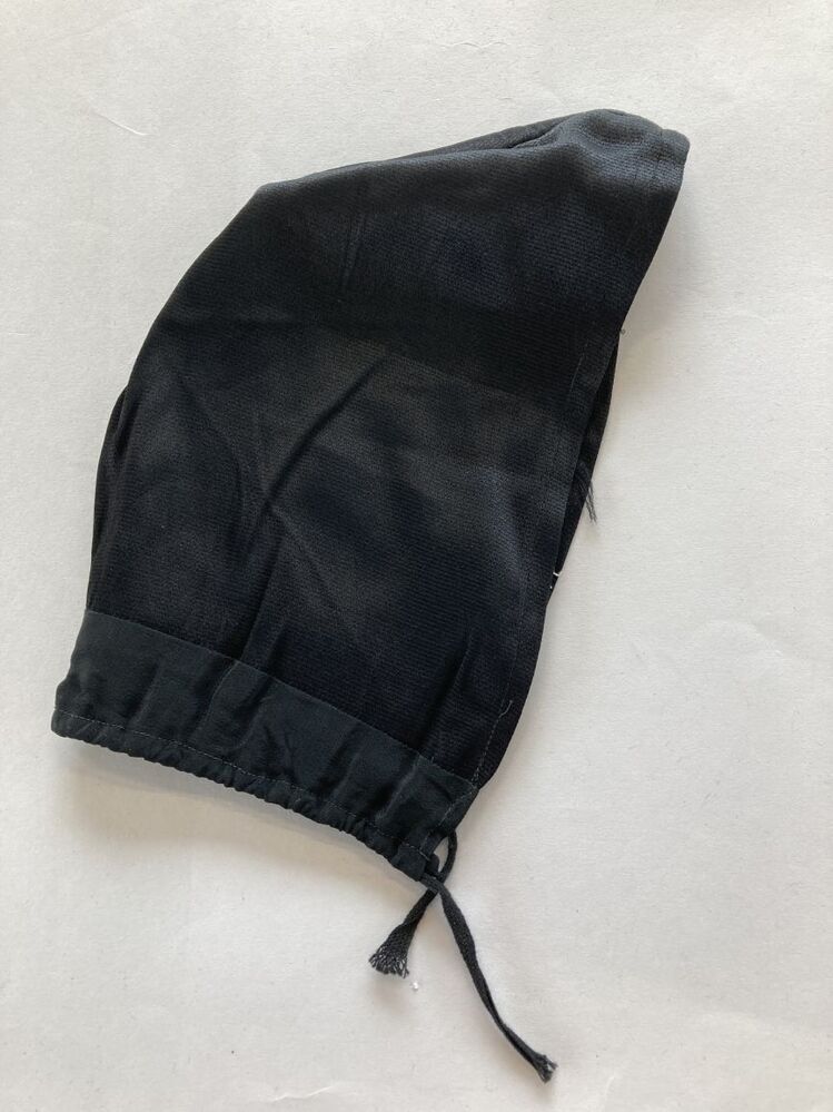 Zwart kunstzijden ondermuts met streepeffect, gedragen met oorijzer