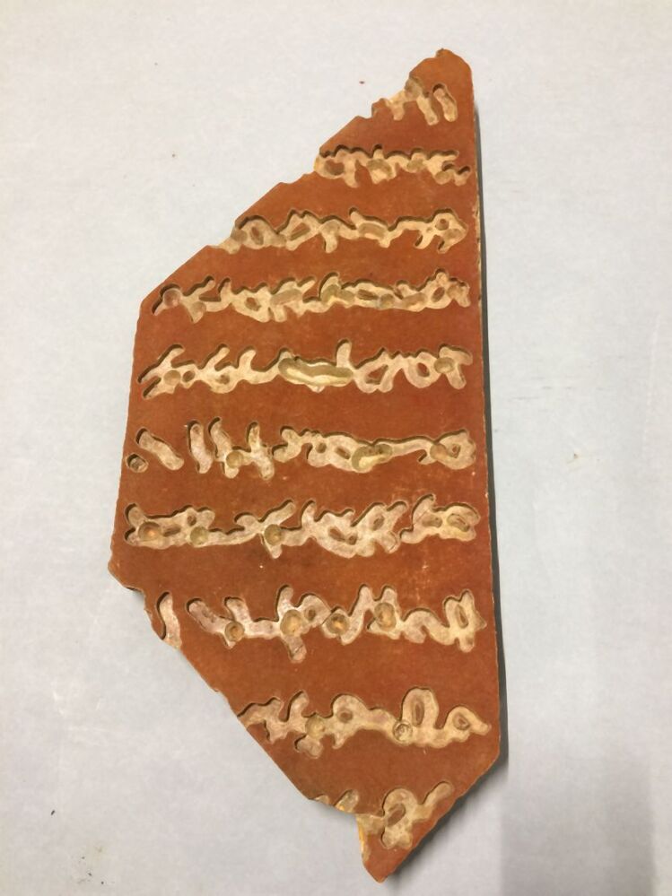 Drukblok van katoendrukkerij Vlisco te Helmond met chinees aandoende tekens, een zogenaamde vulder, onderdeel van groep van drie