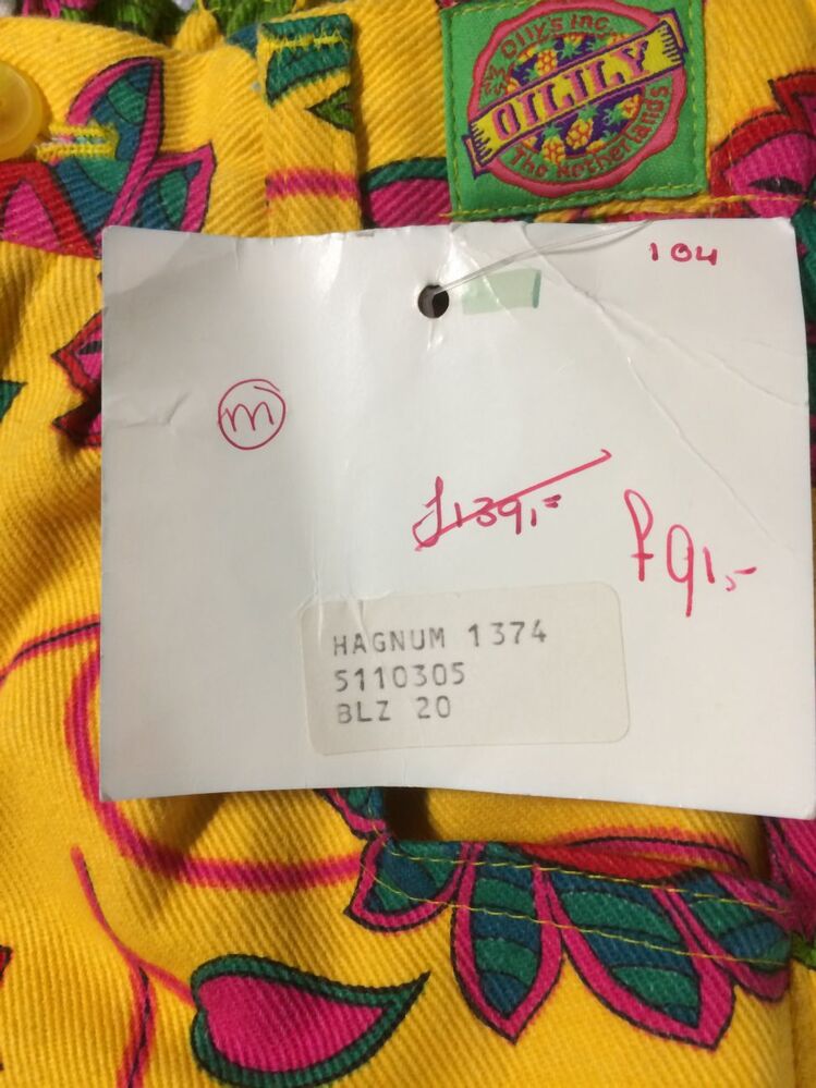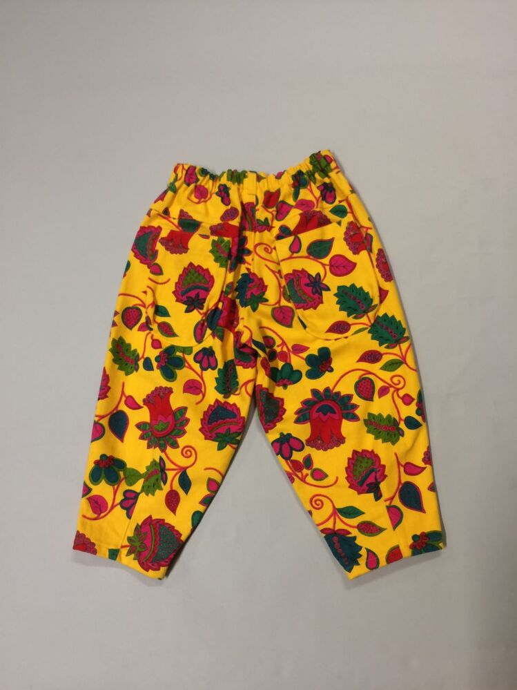 Lange meisjesbroek van gele gebloemde keperstof met sitspatroon, en gulpsluiting