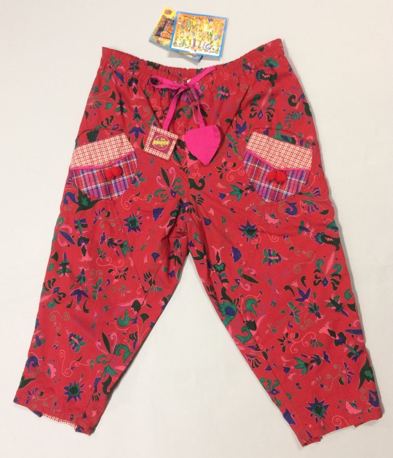 Lange wijde meisjesbroek van rood sitsachtig gebloemd katoen, bedrukt met blauw-groen en roze bloemen