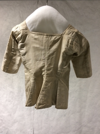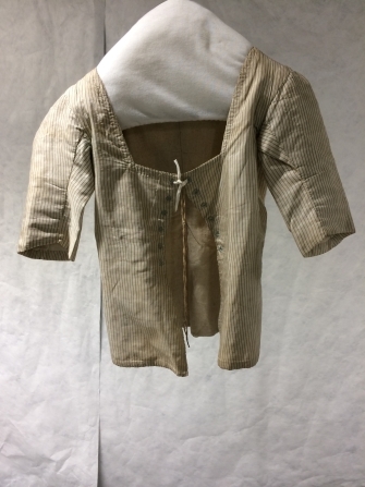 Onderjak of huisjak van witte zijde met blauwe streepjes