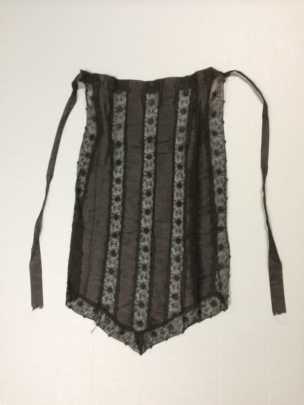 Zwart schortje genaaid van afwisselend vier cm. breed tule geborduurd met rayon, bloemmotief en vier cm. breed lusterband