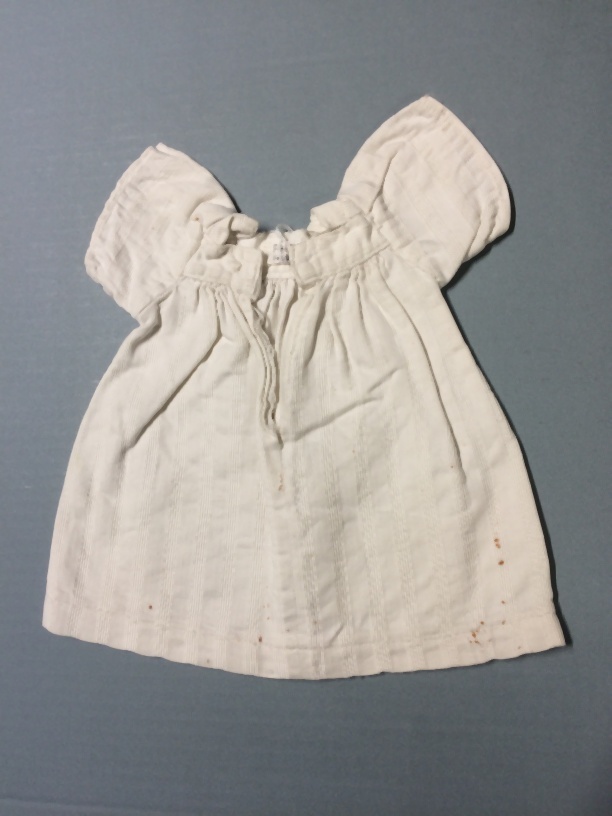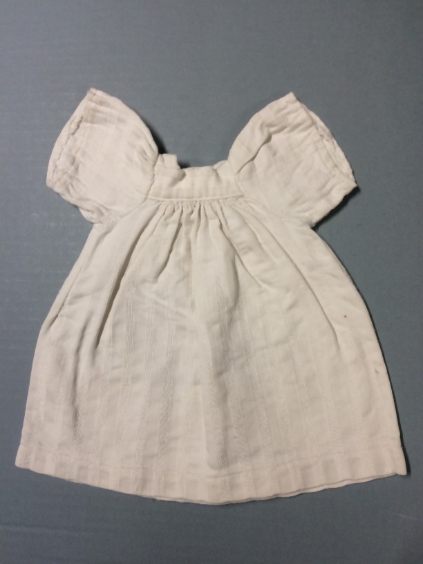 Poppenjurkje van wit katoen, ingeweven streep en met pofmouw