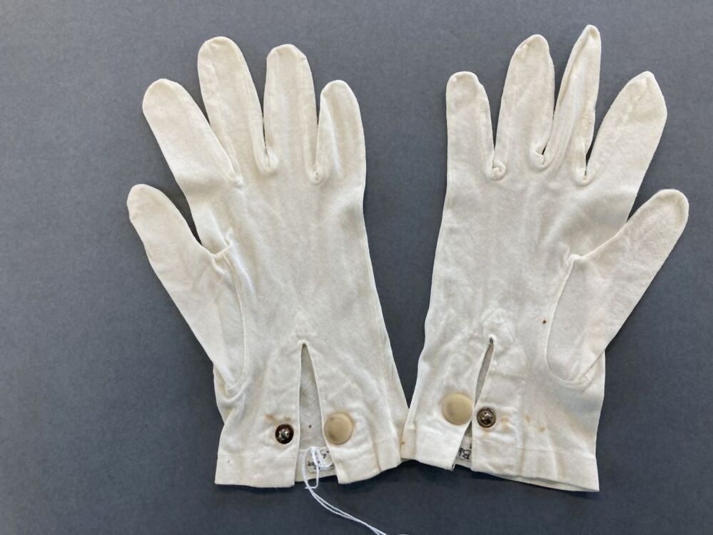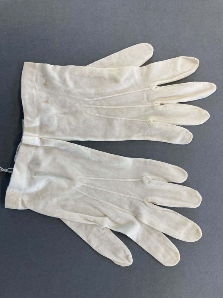 Paar wit katoenen tricot herenhandschoenen, onderdeel van groep van twee