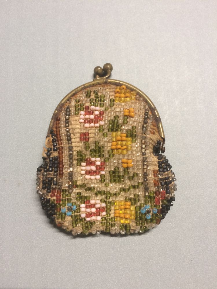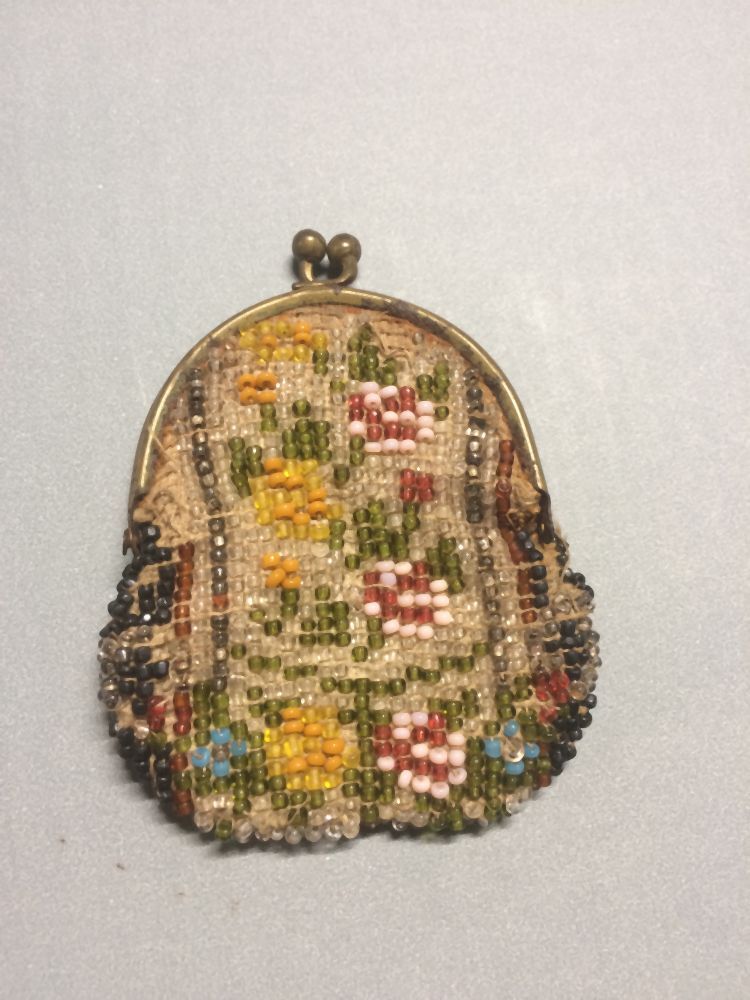 Geborduurd kralentasje voor pop, aan onedel metalen beugel