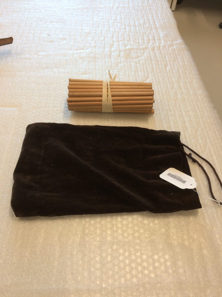 Bruine fluwelen zak met bundel van 54 pijpstokjes, onderdeel van groep van 55