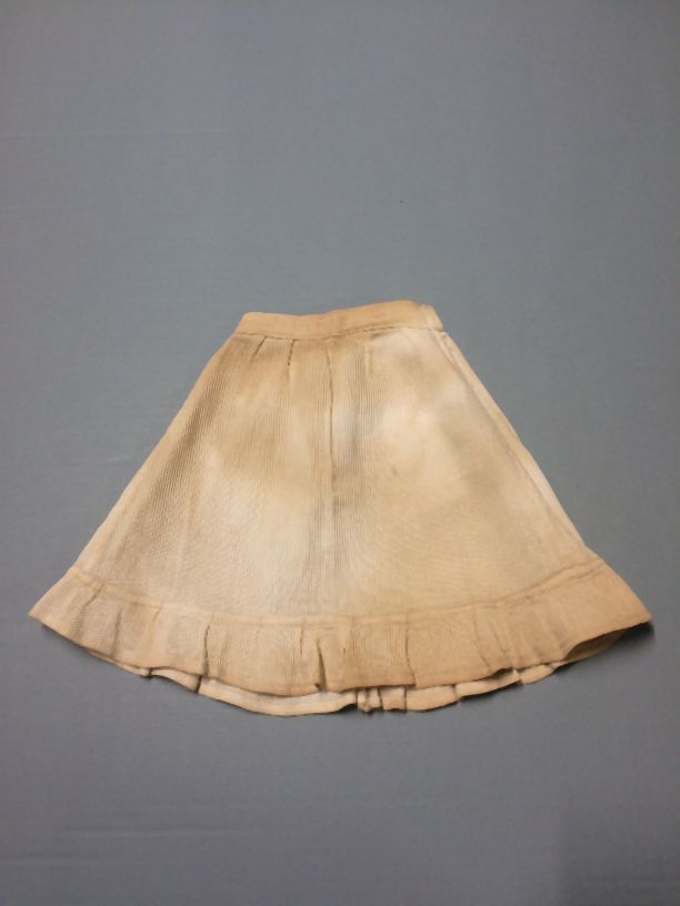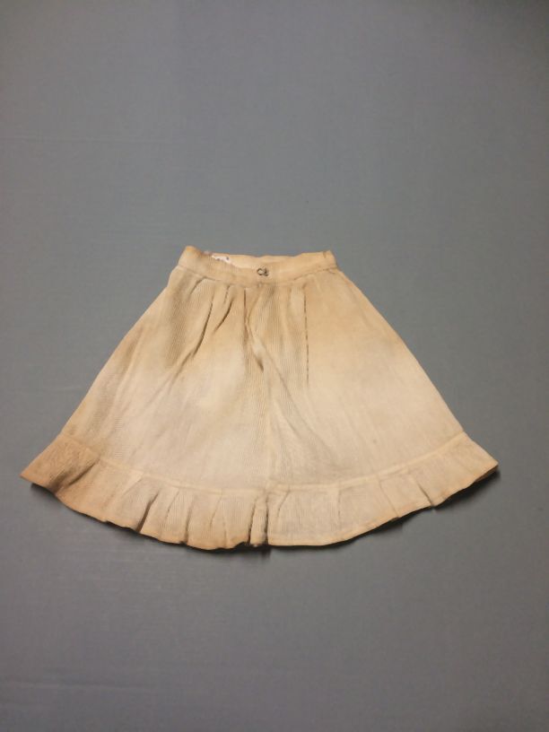 Poppenonderrok van wit ribspiqué, met strook langs de zoom, onderdeel van groep van vijf stuks poppenkleding