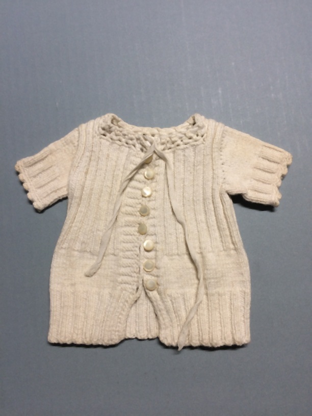 Poppenborstrok gebreid van wit katoen, knoopsluiting middenvoor, onderdeel van groep van vijf stuks poppenkleding