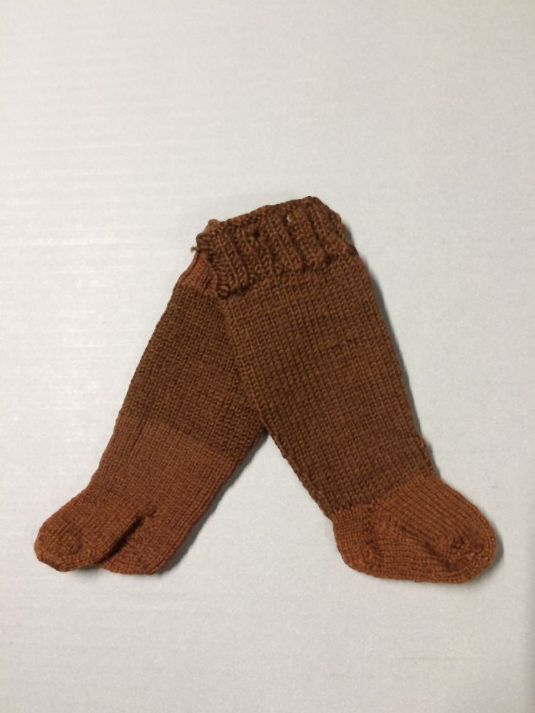 Paar kniekousen voor pop, gebreid van bruine wol, onderdeel van groep van vier paar