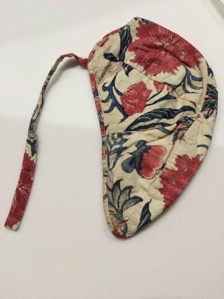 Jongensmuts van sits, witte grond, rode bloemen, blauwe blaadjes, linnen voering