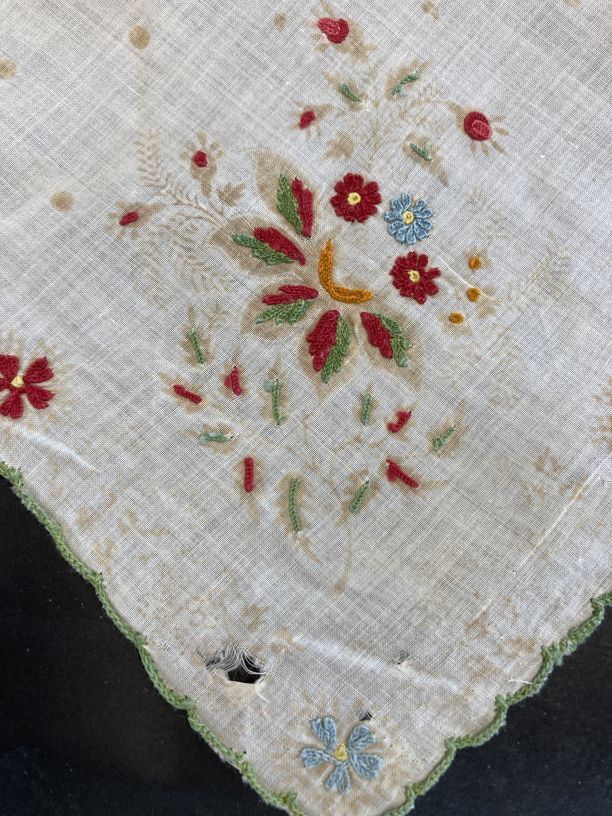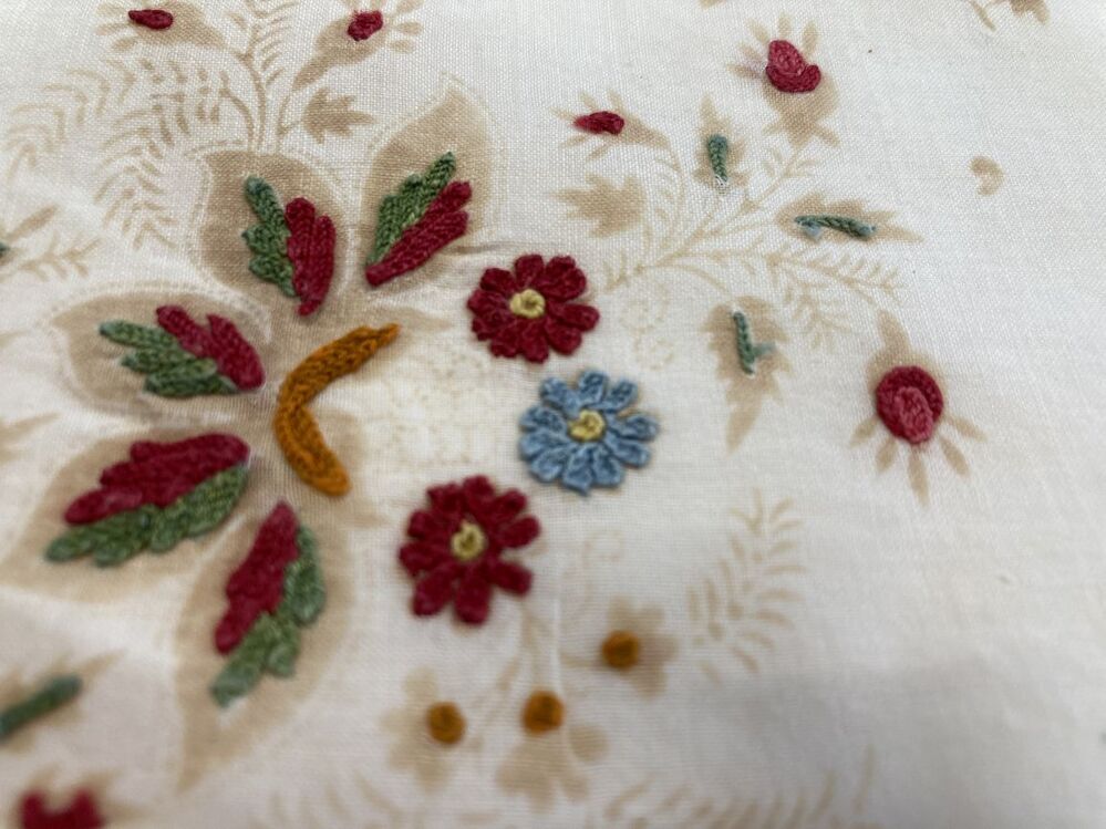 Fichu bedrukt met beige strooimotief dat deels kleurrijk getamboereerd is