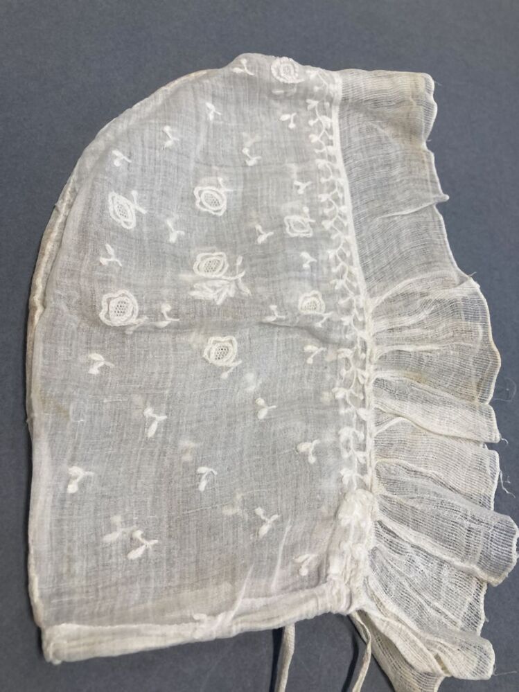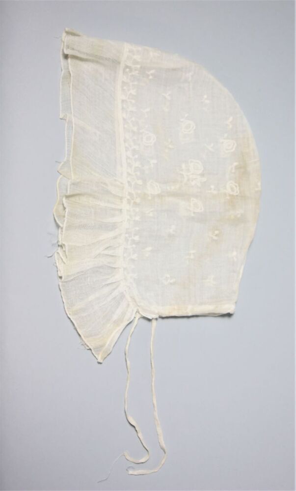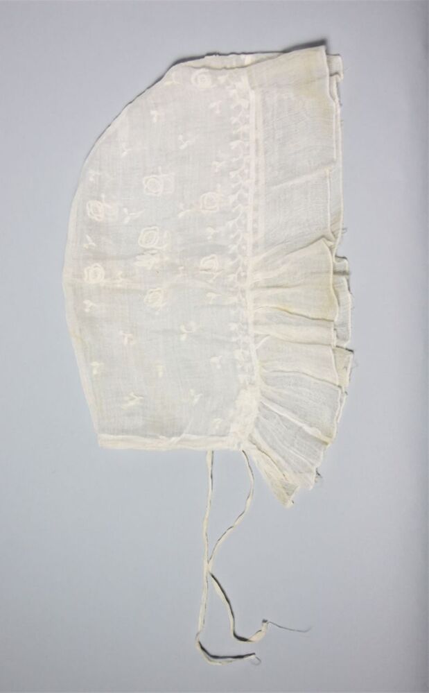 Trekmuts met bol van getamboureerd neteldoek en voorstrook van gaasweefsel, onderdeel van groep van vier