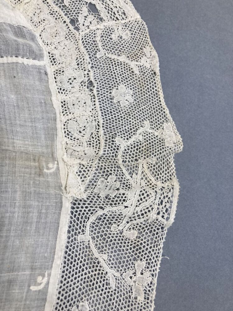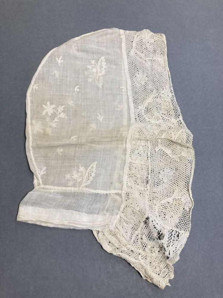 Trekmuts met bol van getamboureerd neteldoek en voorstrook van kloskant, onderdeel van groep van vier
