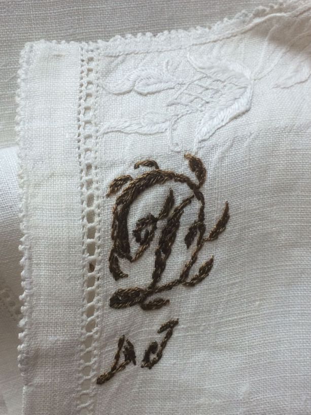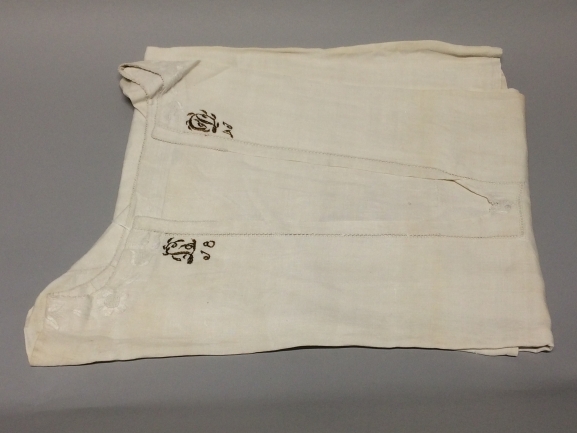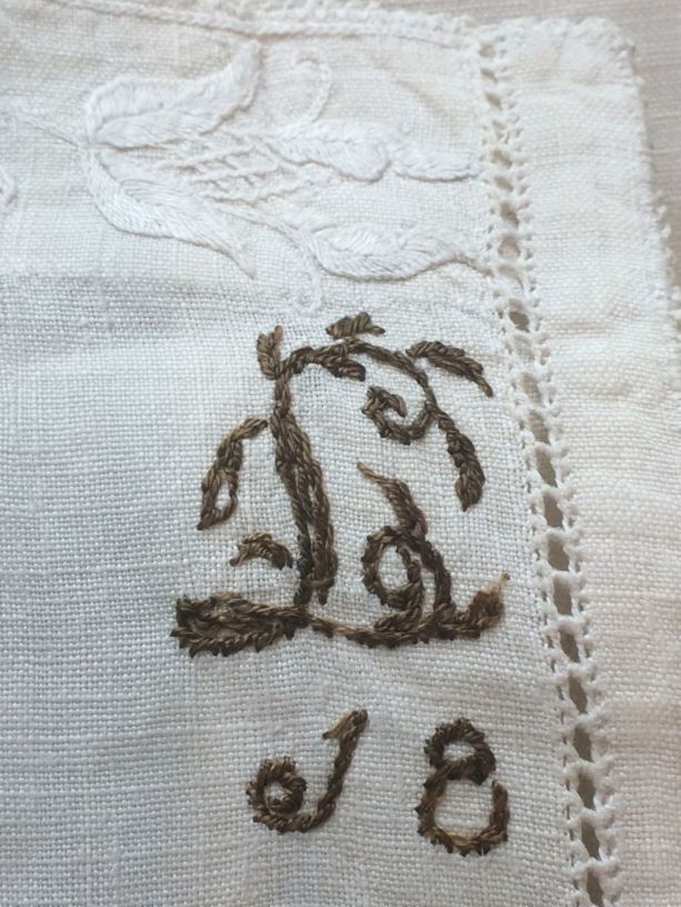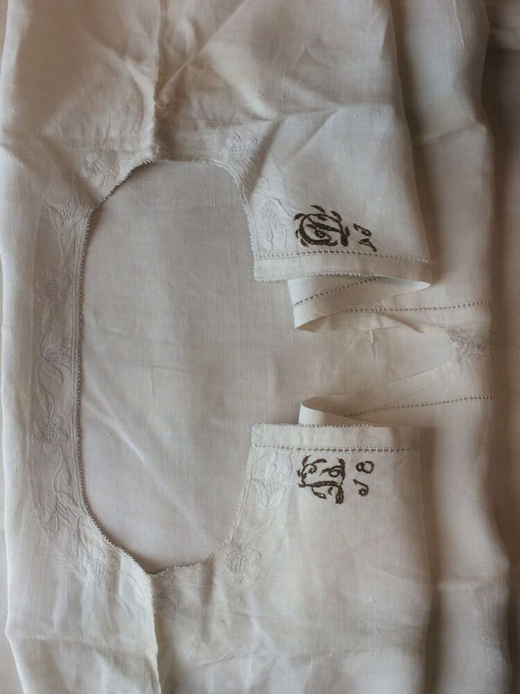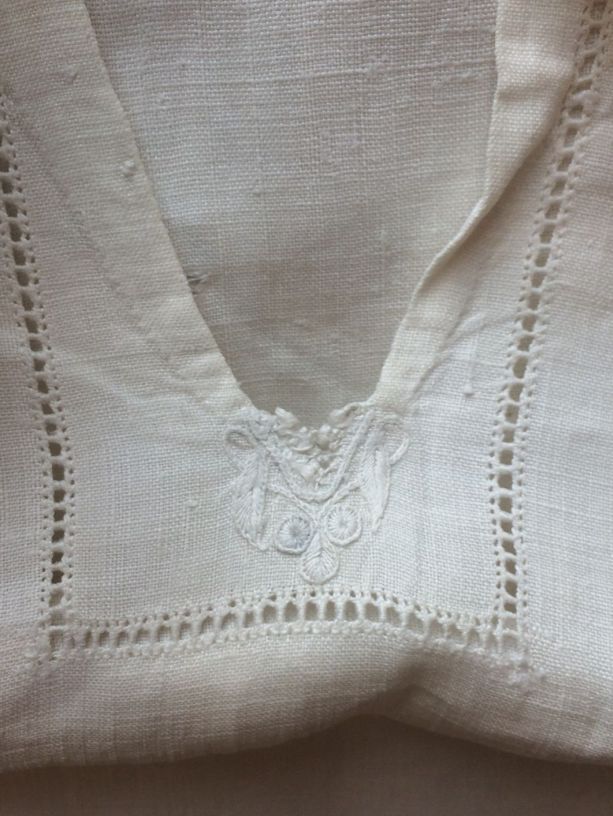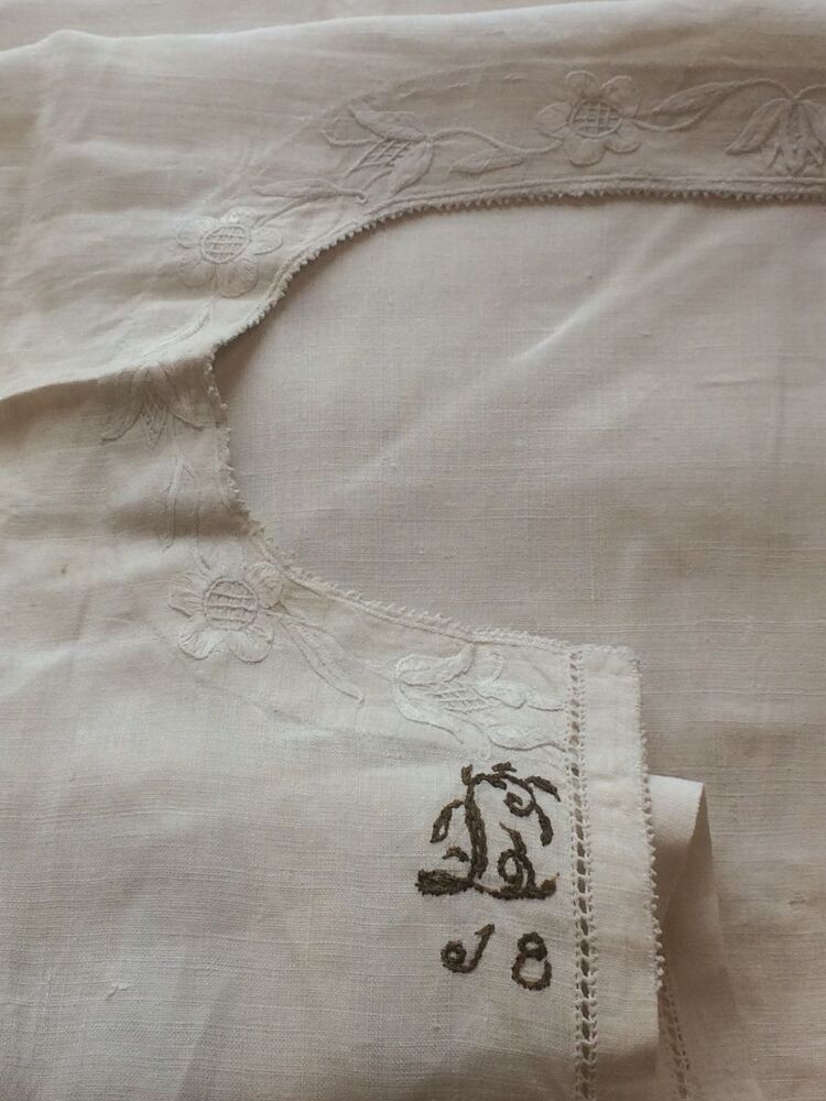Linnen vrouwenhemd met bloemenborduursel langs hals, zijden monogram L D 1841