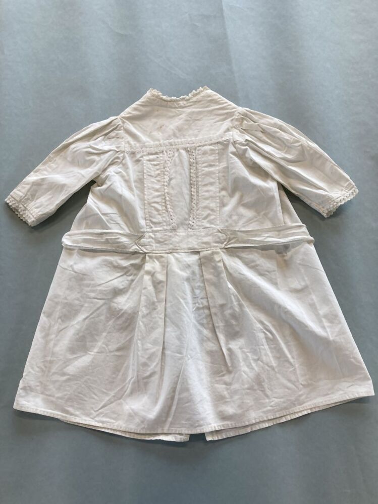 Kinderjurkje met lange mouwen van wit katoen afgezet met broderie