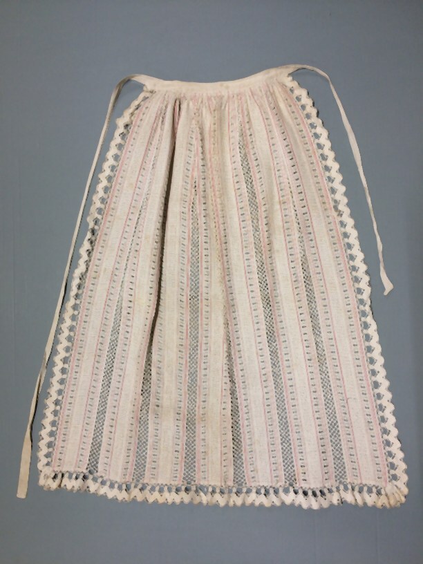 Theeschortje van opengeweven banden met gehaakte tussenzetsels, wit met roze