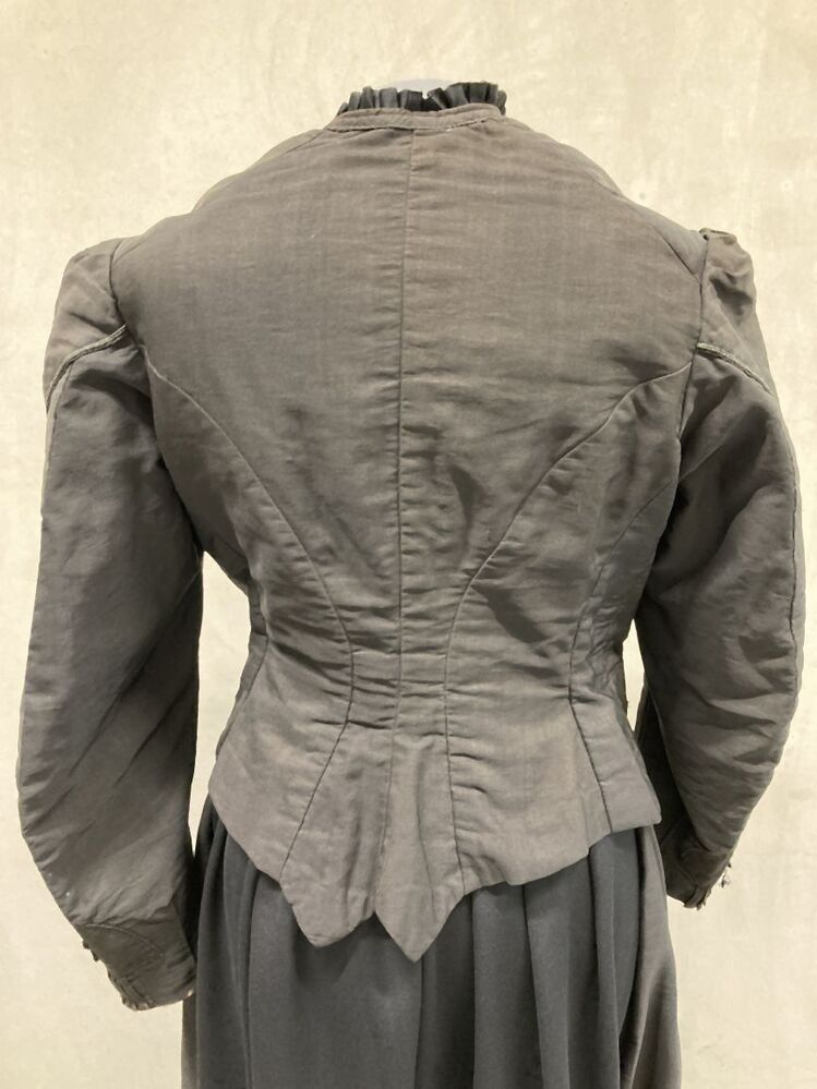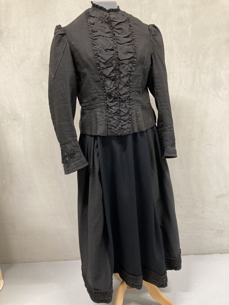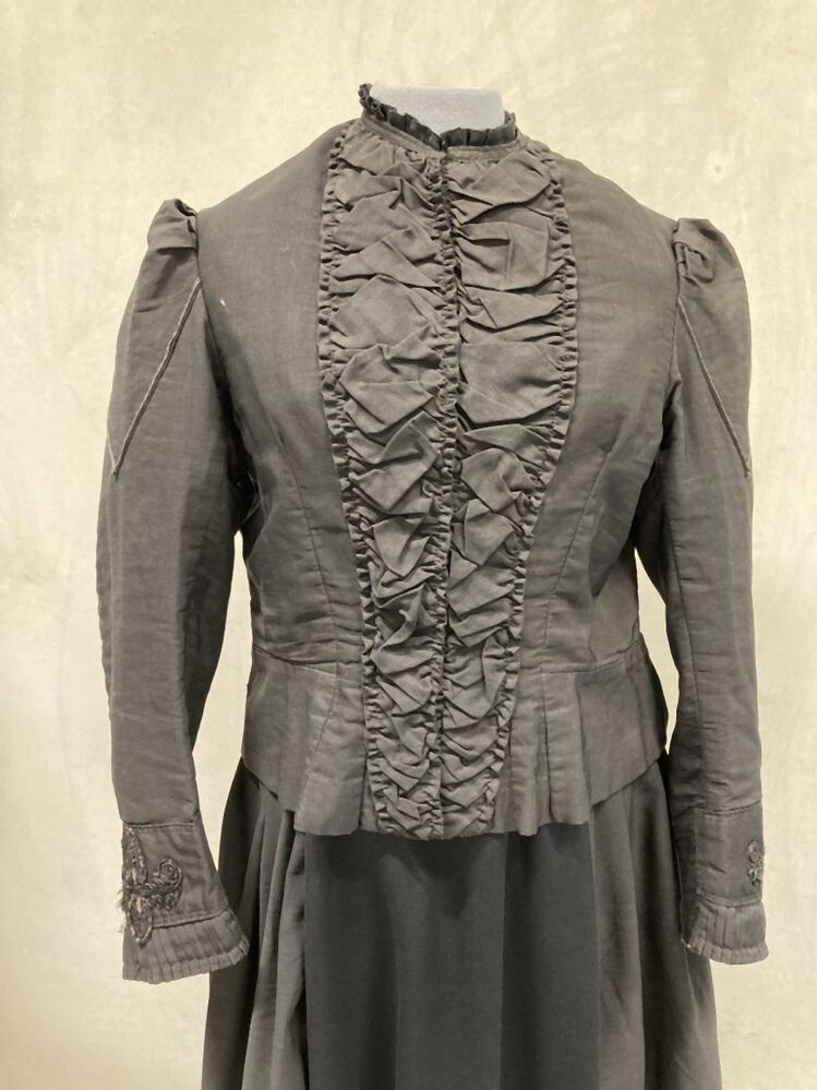 Jak van zwart wollen kostuum versierd met gefronste randen op voorpand