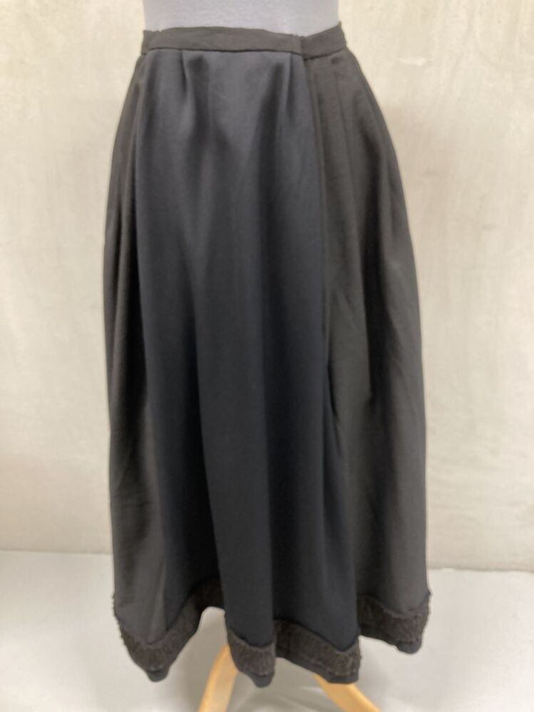 Rok van zwart wollen kostuum versierd met gefronste rand langs zoom