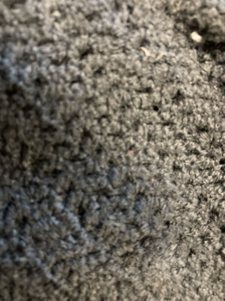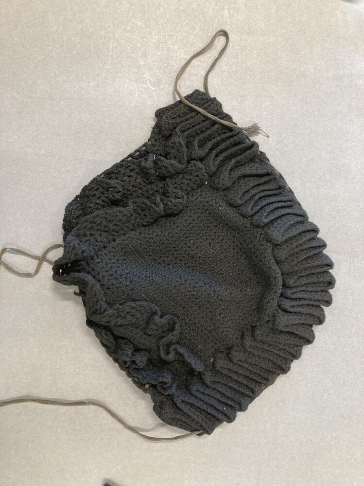 Zwarte gehaakte wollen ochtendmuts met hanekam en stroken