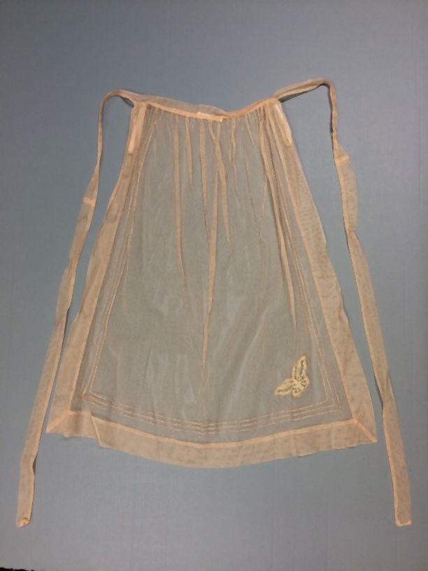 Schort van zalmkleurige tule met filet knoopwerk applikatie, hoort bij tipdoek, onderdeel van groep van twee