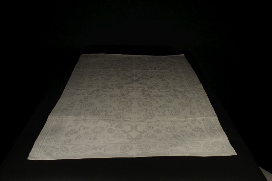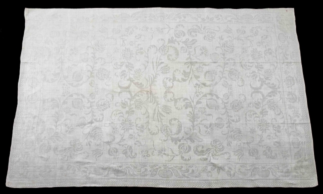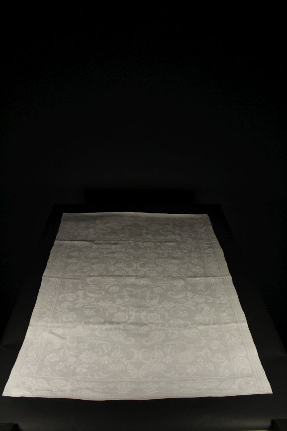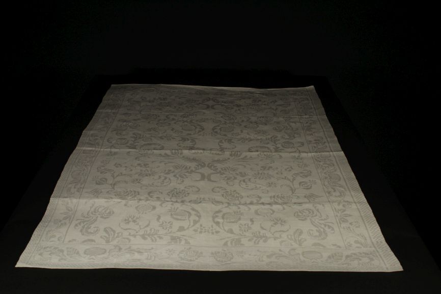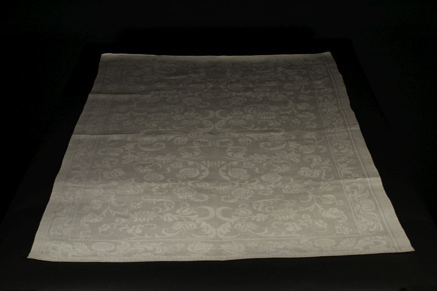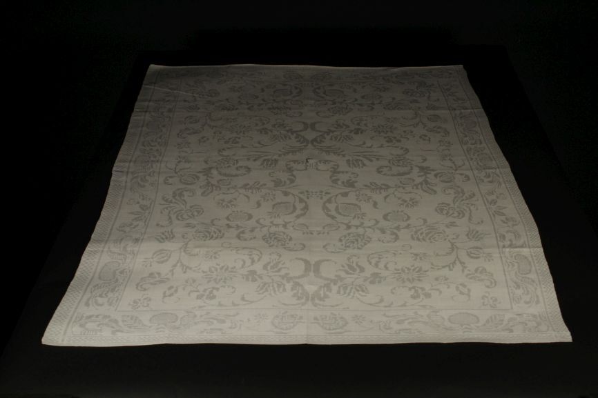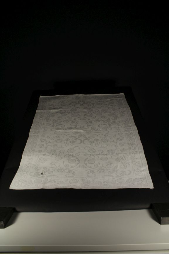 Servet van wit linnen damast met floraal spiegelend patroon, randen met tak en schakelpatroon, onderdeel van groep van tien