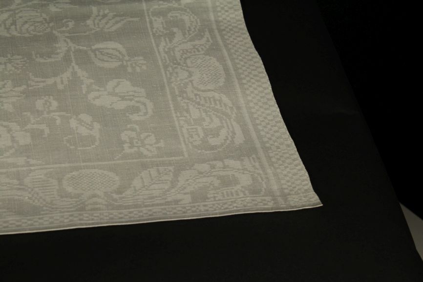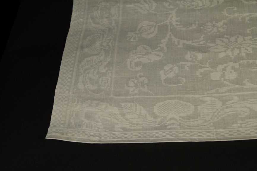 Servet van wit linnen damast met floraal spiegelend patroon, randen met tak en schakelpatroon, onderdeel van groep van tien