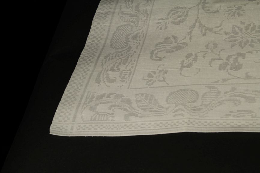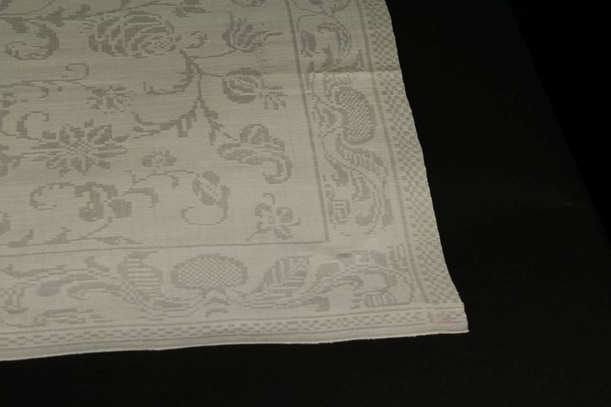 Servet van wit linnen damast met floraal spiegelend patroon, randen met tak en schakelpatroon, onderdeel van groep van tien
