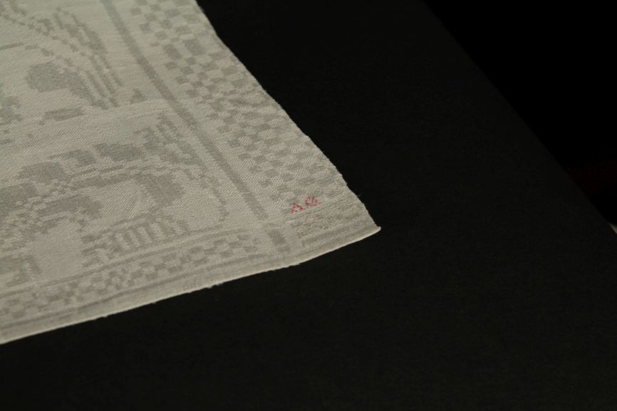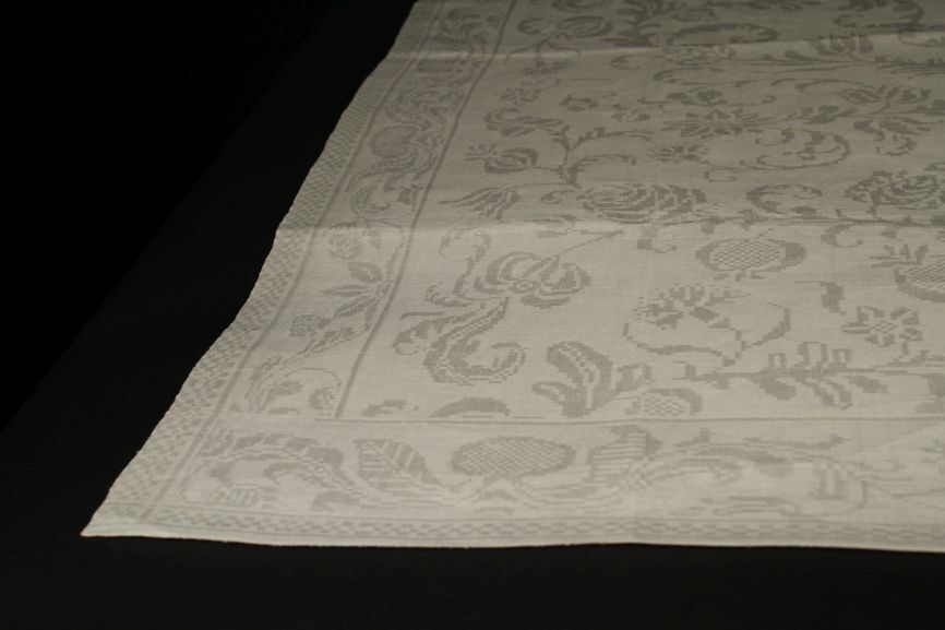 Servet van wit linnen damast met floraal spiegelend patroon, randen met tak en schakelpatroon, onderdeel van groep van tien