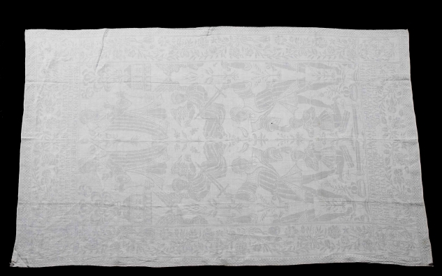 Servet van wit linnen damast met spiegelend patroon van Abraham's offer in Genesis 22, wapen en naam inweving