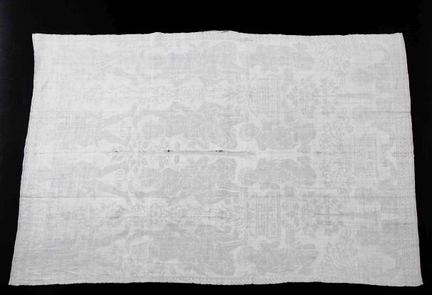 Servet van wit linnen damast met spiegelend patroon van Cain en Abel in Genesis 4: 1-17