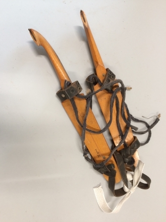 Paar houten schaatsen met leren banden en katoenen veters