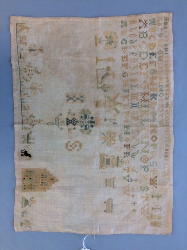 Merkletterlap met zijde borduursel op linnen, gemerkt IS, met grondje en huis, onaf