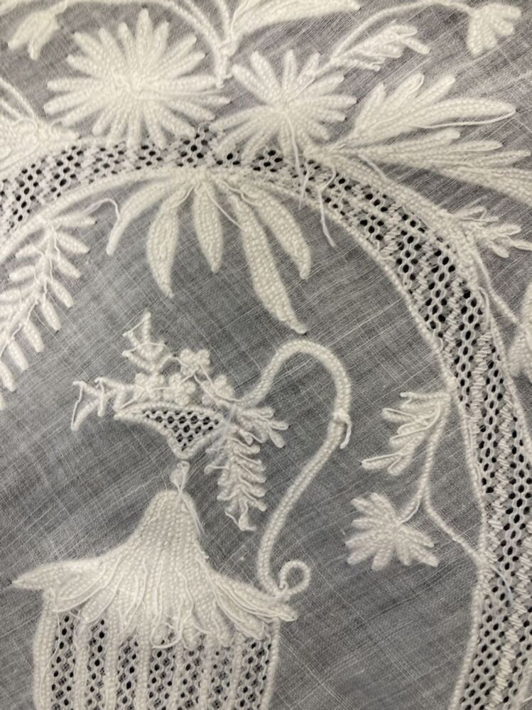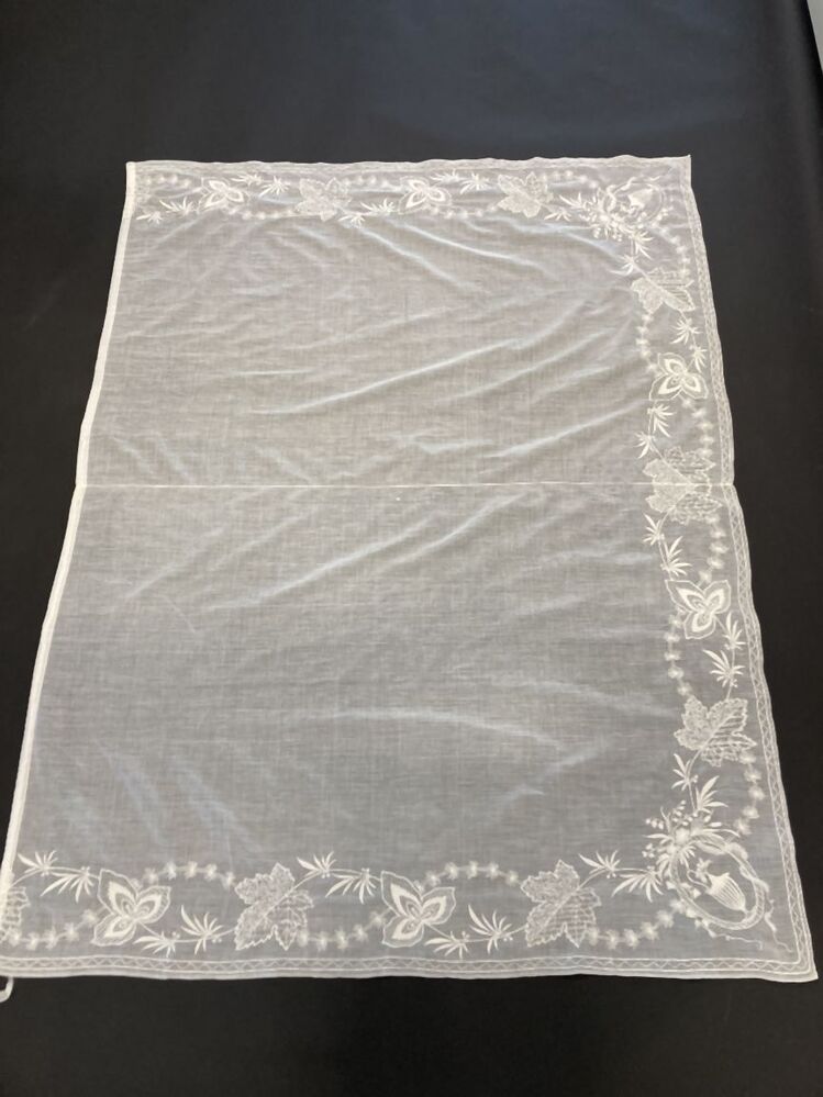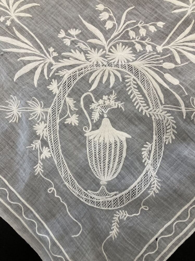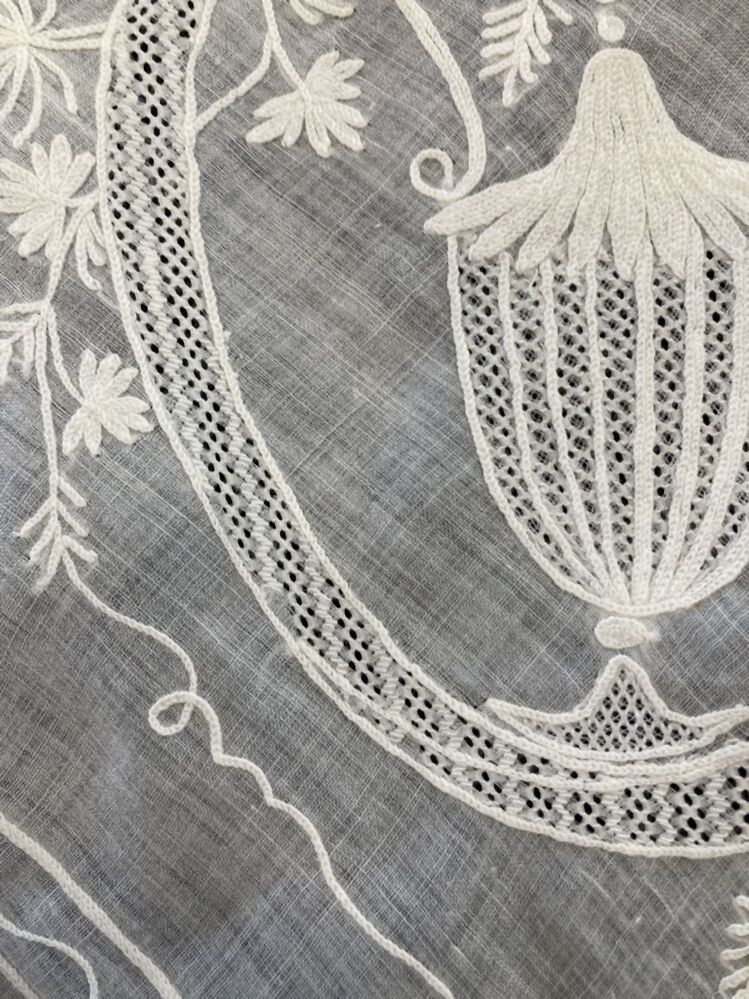 Neteldoek schort met getamboereerde rand met perzisch ajour, in de hoeken ovaal cartouche met vaas