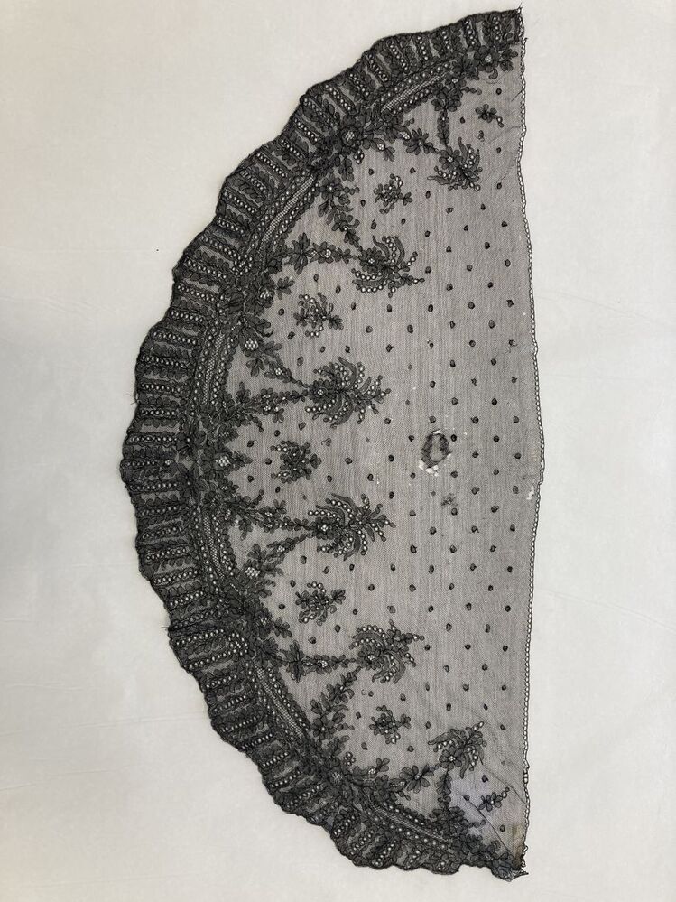 Zwarte halfronde fichukraag van machinaal gebreid kant, met guirlande