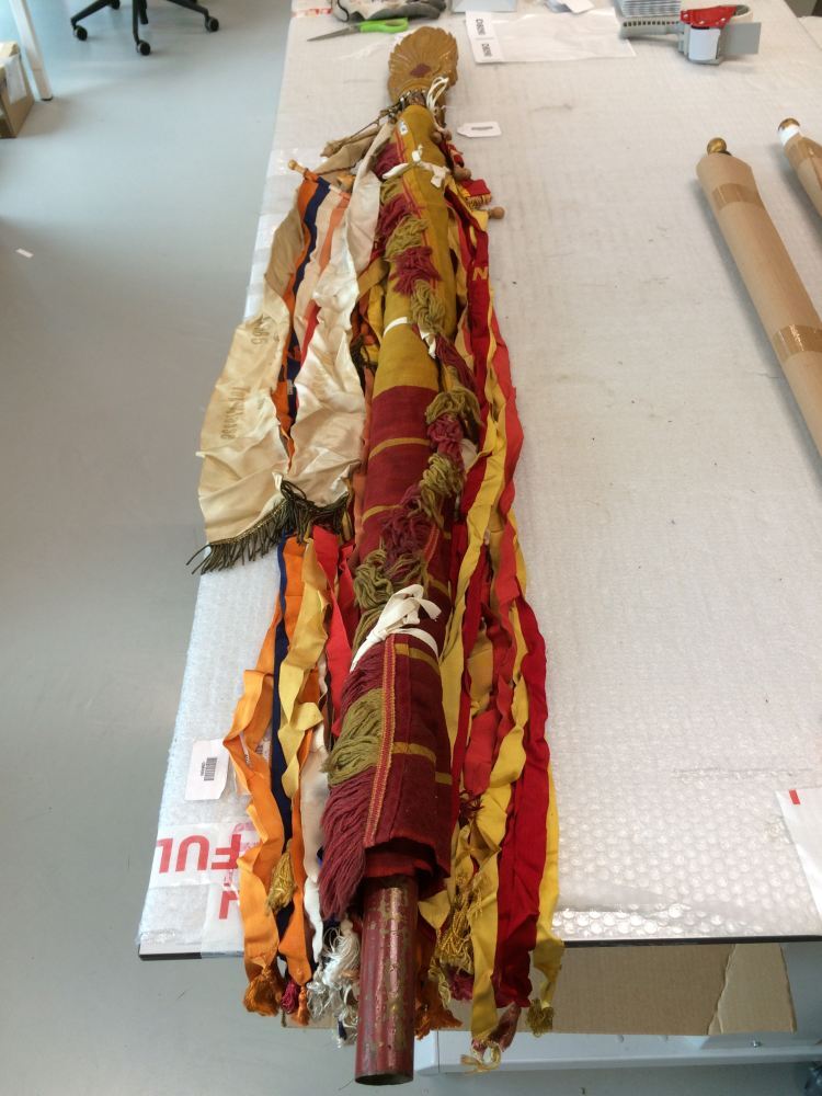 Vlag van gele en rode wol, bedrukt, met letters NFHF en geborduurde oranje kroon, aan geel-rode stok met palmetvormige top waaraan ring met twintig lange en korte vaantjes