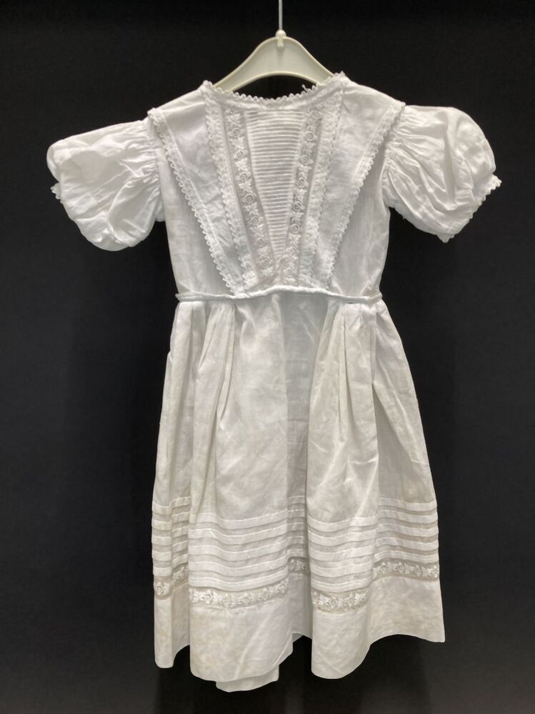 Wit jurkje met pofmouwtjes en V-vormige decoratie in lijfje, met wit galon en borduurwerk