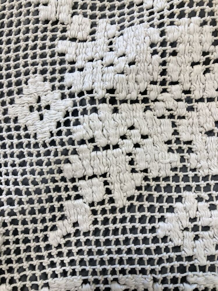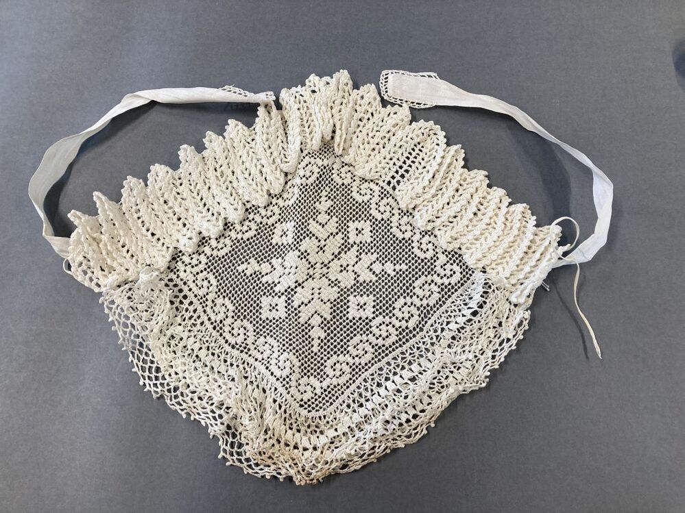 Ochtendmuts met bol van doorgestopt filetknoopwerk en hanekam langs voorzijde