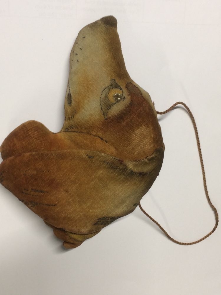 Bruin fluwelen speldenkussen aan één zijde beschilderd met kop van teckel