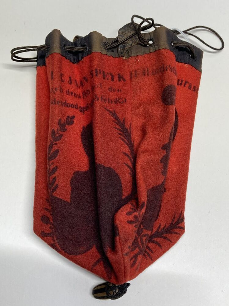 Rood lakens buideltasje bedrukt met zwarte sihouetten, o.a. van Speyk