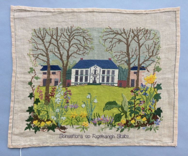 Kruissteekborduurwerk op deels beschilderd stramien met voorstelling van stinzenflora op Fogelsanghstate