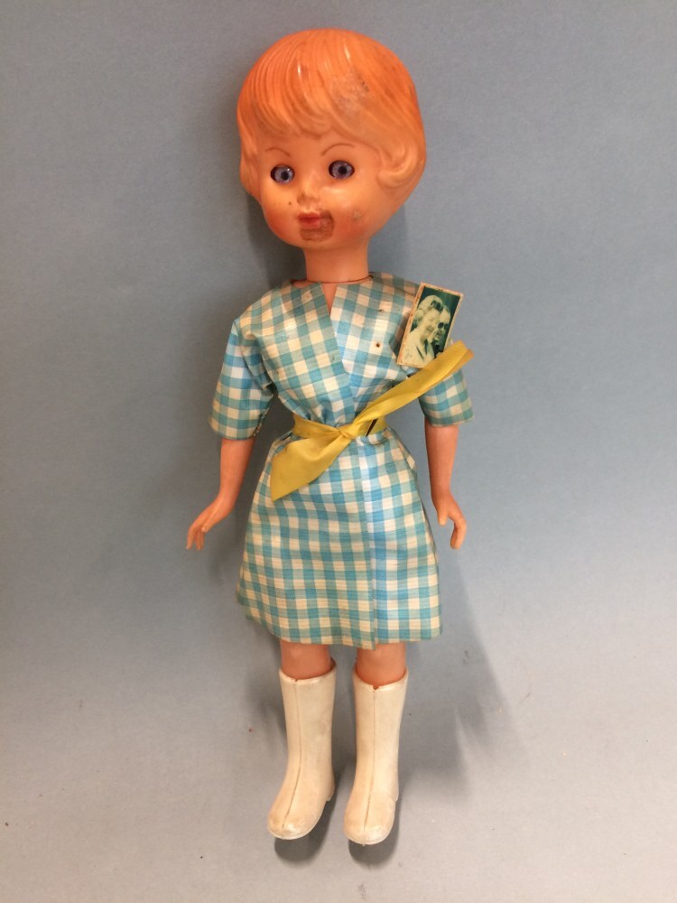Pop van kunststof met slaapogen en lichtblauw beblokt jasje met gele ceintuur en witte laarzen