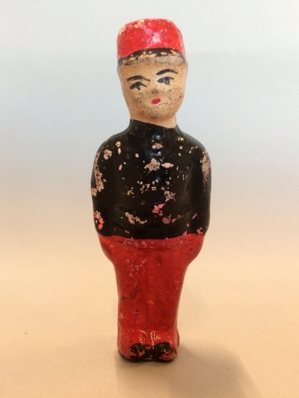 Houten staande pop (soldaat), met rode broek en pet en zwarte trui en schoenen