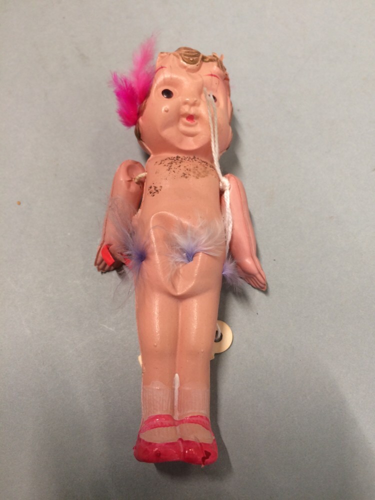Pop zonder kleren met roze veren op hoofd, blauwe veren op boek, rode schoenen en rode wandelstok
