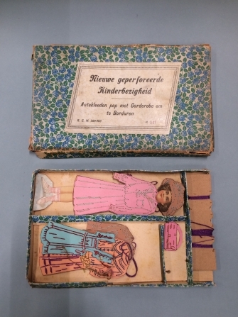 Aankleedpop in doos met kartonnen kleren met borduurwerk