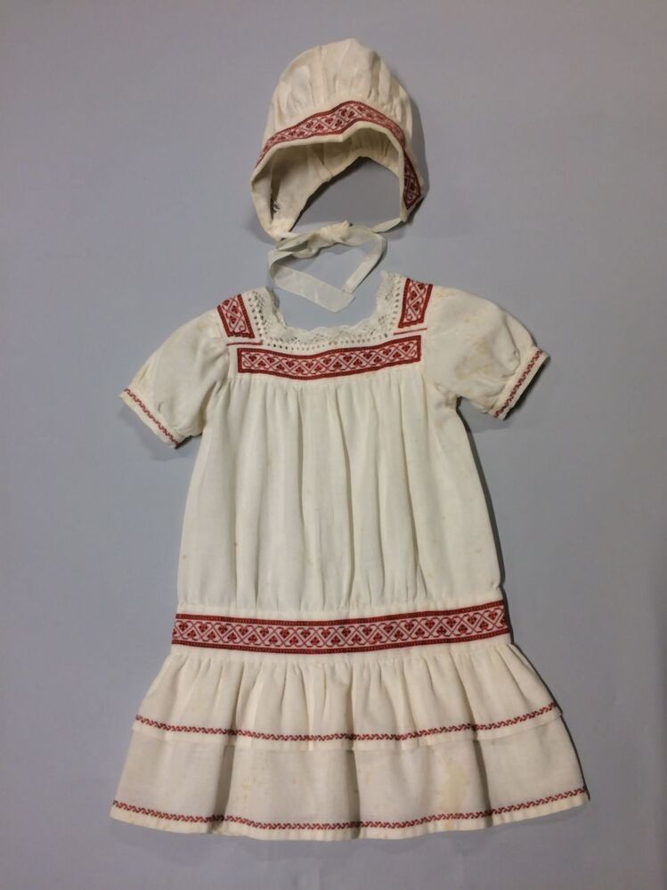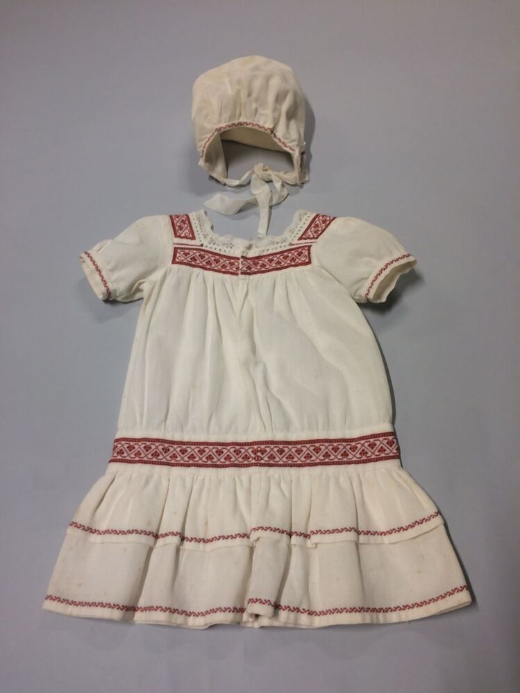 Wit meisjesjurkje met geborduurde folkloristische randen, met bijpassend mutsje