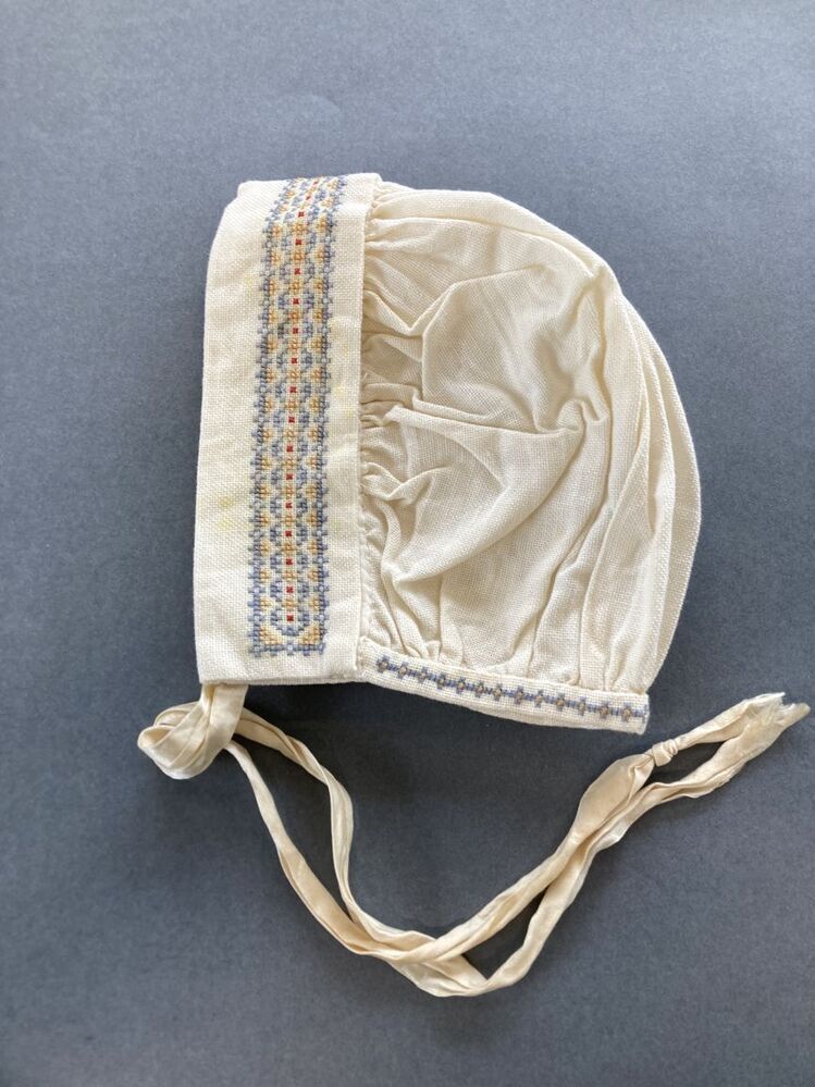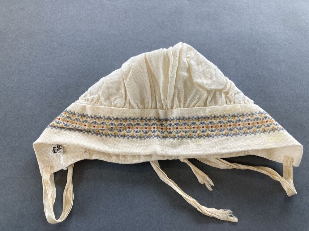 Wit mutsje met geborduurde folkloristische randen in kruissteek