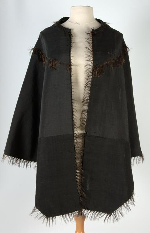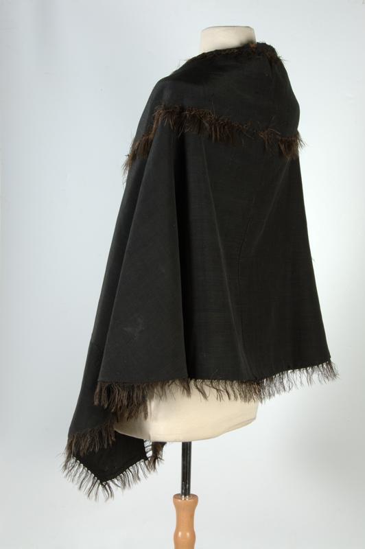 Schoudermantel van zwart mohair met franje, gevoerd met zwarte wol met witte plukjes, 'omgekeerd hermelijn'