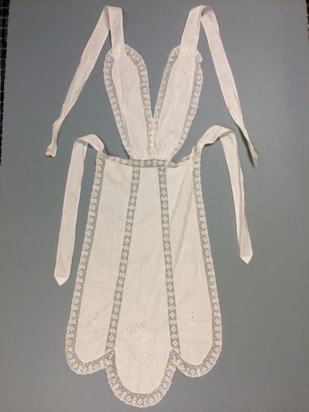 Wit schort met brede schouderbanden, verwerkt met machinaal kloskant