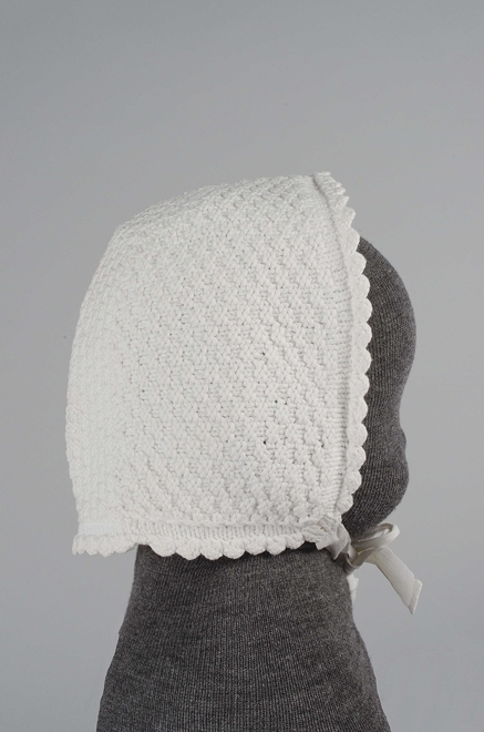 Kindermuts gebreid van wit katoen met blokjespatroon en geschulpt gehaakte rand