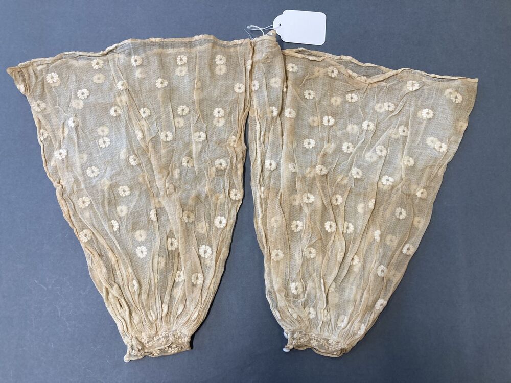 Paar beige ondermouwen van gebrocheerd ajour neteldoek met geborduurde manchetjes